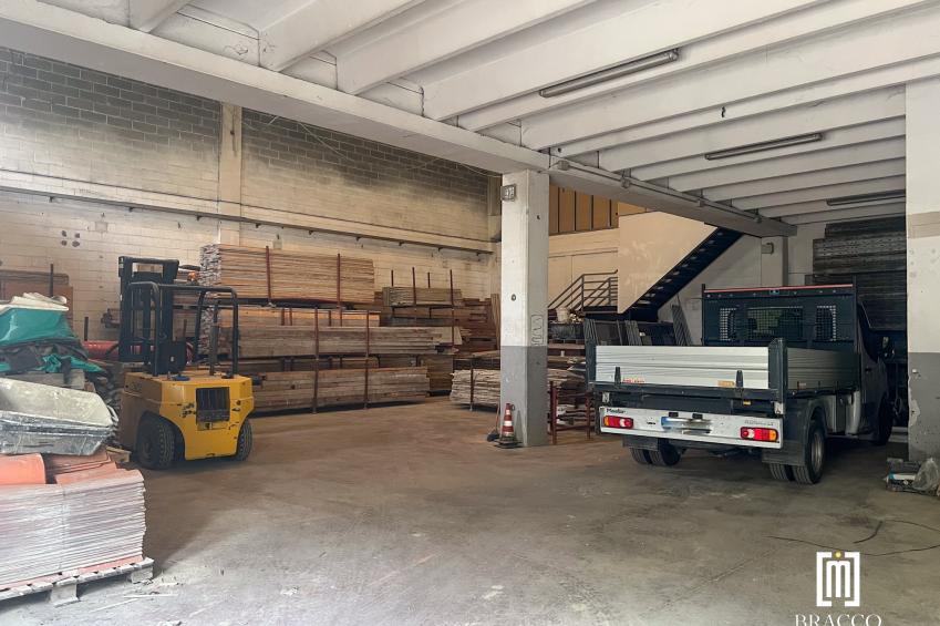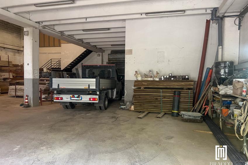 Lato sinistro: locale ad uso artigianale dotato di un piccolo locale ufficio, con disimpegno e un bagno, ulteriore piccolo locale con accesso pedonale dall’esterno e soppalco al piano primo di mq 150 circa, ideale come area operativa o laboratorio;